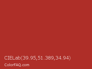 CIELab 39.95,51.389,34.94 Color is a normal red color and the nearest color is Tall Poppy #b32d29. Hex code #af2e28 and RGB value is rgb(175,46,40). In RGB color space, this color is composed of 69% red, 18% green, 16% blue, In CMYK color space, this color is composed of 0% cyan, 74% magenta, 77% yellow , 31% black , In HSL color space, this color has a hue angle of 3° , 63% saturation and 42% lightness.