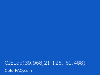 CIELab 39.968,21.128,-61.488 Color is a normal blue color and the nearest color is Denim #1560bd. Hex code #0f59c4 and RGB value is rgb(15,89,196). In RGB color space, this color is composed of 6% red, 35% green, 77% blue, In CMYK color space, this color is composed of 92% cyan, 55% magenta, 0% yellow , 23% black , In HSL color space, this color has a hue angle of 215° , 86% saturation and 41% lightness.