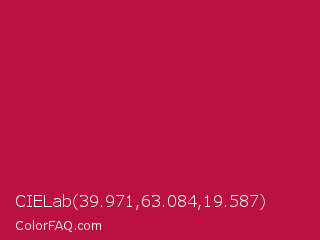 CIELab 39.971,63.084,19.587 Color is a normal rose color and the nearest color is Pictorial Carmine #c30b4e. Hex code #ba1142 and RGB value is rgb(186,17,66). In RGB color space, this color is composed of 73% red, 7% green, 26% blue, In CMYK color space, this color is composed of 0% cyan, 91% magenta, 65% yellow , 27% black , In HSL color space, this color has a hue angle of 343° , 83% saturation and 40% lightness.