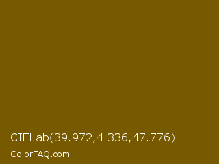 CIELab 39.972,4.336,47.776 Color is a dark orange color and the nearest color is Yukon Gold #7b6608. Hex code #775a00 and RGB value is rgb(119,90,0). In RGB color space, this color is composed of 47% red, 35% green, 0% blue, In CMYK color space, this color is composed of 0% cyan, 24% magenta, 100% yellow , 53% black , In HSL color space, this color has a hue angle of 45° , 100% saturation and 23% lightness.
