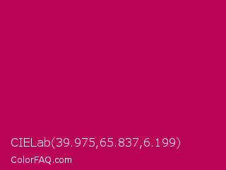 CIELab 39.975,65.837,6.199 Color is a normal rose color and the nearest color is Pictorial Carmine #c30b4e. Hex code #ba0557 and RGB value is rgb(186,5,87). In RGB color space, this color is composed of 73% red, 2% green, 34% blue, In CMYK color space, this color is composed of 0% cyan, 97% magenta, 53% yellow , 27% black , In HSL color space, this color has a hue angle of 333° , 95% saturation and 37% lightness.