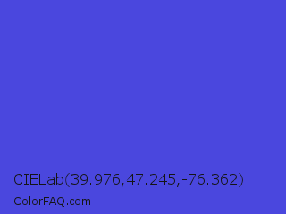 CIELab 39.976,47.245,-76.362 Color is a normal indigo color and the nearest color is Iris #5a4fcf. Hex code #4a47de and RGB value is rgb(74,71,222). In RGB color space, this color is composed of 29% red, 28% green, 87% blue, In CMYK color space, this color is composed of 67% cyan, 68% magenta, 0% yellow , 13% black , In HSL color space, this color has a hue angle of 241° , 70% saturation and 57% lightness.