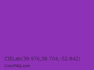 CIELab 39.976,58.704,-52.842 Color is a normal purple color and the nearest color is Dark Orchid #9932cc. Hex code #8d31b6 and RGB value is rgb(141,49,182). In RGB color space, this color is composed of 55% red, 19% green, 71% blue, In CMYK color space, this color is composed of 23% cyan, 73% magenta, 0% yellow , 29% black , In HSL color space, this color has a hue angle of 282° , 58% saturation and 45% lightness.