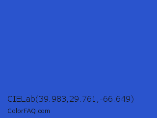 CIELab 39.983,29.761,-66.649 Color is a normal blue color and the nearest color is New Car #214fc6. Hex code #2a54cd and RGB value is rgb(42,84,205). In RGB color space, this color is composed of 16% red, 33% green, 80% blue, In CMYK color space, this color is composed of 80% cyan, 59% magenta, 0% yellow , 20% black , In HSL color space, this color has a hue angle of 225° , 66% saturation and 48% lightness.
