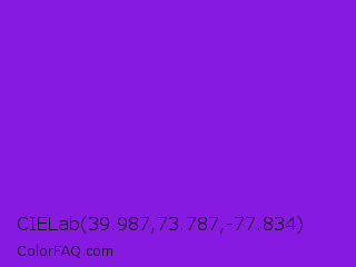 CIELab 39.987,73.787,-77.834 Color is a normal purple color and the nearest color is Blue Violet #8a2be2. Hex code #861ae1 and RGB value is rgb(134,26,225). In RGB color space, this color is composed of 53% red, 10% green, 88% blue, In CMYK color space, this color is composed of 40% cyan, 88% magenta, 0% yellow , 12% black , In HSL color space, this color has a hue angle of 273° , 79% saturation and 49% lightness.