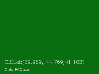 CIELab 39.989,-44.769,41.103 Color is a dark green color and the nearest color is Japanese Laurel #0a6906. Hex code #096e0f and RGB value is rgb(9,110,15). In RGB color space, this color is composed of 4% red, 43% green, 6% blue, In CMYK color space, this color is composed of 92% cyan, 0% magenta, 86% yellow , 57% black , In HSL color space, this color has a hue angle of 124° , 85% saturation and 23% lightness.