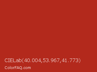 CIELab 40.004,53.967,41.773 Color is a normal red color and the nearest color is Firebrick #b22222. Hex code #b3291c and RGB value is rgb(179,41,28). In RGB color space, this color is composed of 70% red, 16% green, 11% blue, In CMYK color space, this color is composed of 0% cyan, 77% magenta, 84% yellow , 30% black , In HSL color space, this color has a hue angle of 5° , 73% saturation and 41% lightness.