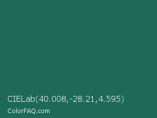 CIELab 40.008,-28.21,4.595 Color is a dark cyan color and the nearest color is Dark Spring Green #177245. Hex code #1e6a56 and RGB value is rgb(30,106,86). In RGB color space, this color is composed of 12% red, 42% green, 34% blue, In CMYK color space, this color is composed of 72% cyan, 0% magenta, 19% yellow , 58% black , In HSL color space, this color has a hue angle of 164° , 56% saturation and 27% lightness.