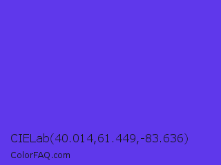 CIELab 40.014,61.449,-83.636 Color is a normal indigo color and the nearest color is Majorelle Blue #6050dc. Hex code #5f38eb and RGB value is rgb(95,56,235). In RGB color space, this color is composed of 37% red, 22% green, 92% blue, In CMYK color space, this color is composed of 60% cyan, 76% magenta, 0% yellow , 8% black , In HSL color space, this color has a hue angle of 253° , 82% saturation and 57% lightness.
