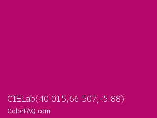 CIELab 40.015,66.507,-5.88 Color is a normal magenta color and the nearest color is Lipstick #ab0563. Hex code #b7076a and RGB value is rgb(183,7,106). In RGB color space, this color is composed of 72% red, 3% green, 42% blue, In CMYK color space, this color is composed of 0% cyan, 96% magenta, 42% yellow , 28% black , In HSL color space, this color has a hue angle of 326° , 93% saturation and 37% lightness.