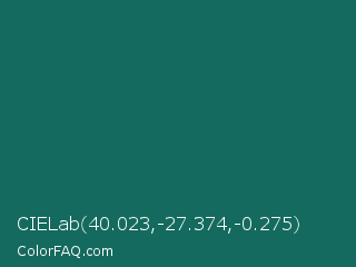 CIELab 40.023,-27.374,-0.275 Color is a dark cyan color and the nearest color is Genoa #15736b. Hex code #146a5e and RGB value is rgb(20,106,94). In RGB color space, this color is composed of 8% red, 42% green, 37% blue, In CMYK color space, this color is composed of 81% cyan, 0% magenta, 11% yellow , 58% black , In HSL color space, this color has a hue angle of 172° , 68% saturation and 25% lightness.
