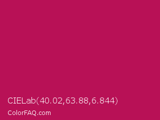 CIELab 40.02,63.88,6.844 Color is a normal rose color and the nearest color is Pictorial Carmine #c30b4e. Hex code #b81156 and RGB value is rgb(184,17,86). In RGB color space, this color is composed of 72% red, 7% green, 34% blue, In CMYK color space, this color is composed of 0% cyan, 91% magenta, 53% yellow , 28% black , In HSL color space, this color has a hue angle of 335° , 83% saturation and 39% lightness.