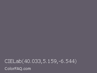 CIELab 40.033,5.159,-6.544 Color is a normal violet color and the nearest color is Mid Gray #5f5f6e. Hex code #625c69 and RGB value is rgb(98,92,105). In RGB color space, this color is composed of 38% red, 36% green, 41% blue, In CMYK color space, this color is composed of 7% cyan, 12% magenta, 0% yellow , 59% black , In HSL color space, this color has a hue angle of 268° , 7% saturation and 39% lightness.