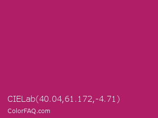CIELab 40.04,61.172,-4.71 Color is a normal rose color and the nearest color is Rich Maroon #b03060. Hex code #b11e68 and RGB value is rgb(177,30,104). In RGB color space, this color is composed of 69% red, 12% green, 41% blue, In CMYK color space, this color is composed of 0% cyan, 83% magenta, 41% yellow , 31% black , In HSL color space, this color has a hue angle of 330° , 71% saturation and 41% lightness.