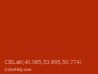 CIELab 40.085,53.895,50.774 Color is a normal red color and the nearest color is Rufous #a81c07. Hex code #b42906 and RGB value is rgb(180,41,6). In RGB color space, this color is composed of 71% red, 16% green, 2% blue, In CMYK color space, this color is composed of 0% cyan, 77% magenta, 97% yellow , 29% black , In HSL color space, this color has a hue angle of 12° , 94% saturation and 36% lightness.