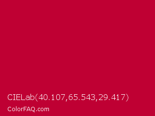 CIELab 40.107,65.543,29.417 Color is a normal rose color and the nearest color is Crimson Glory #be0032. Hex code #bf0033 and RGB value is rgb(191,0,51). In RGB color space, this color is composed of 75% red, 0% green, 20% blue, In CMYK color space, this color is composed of 0% cyan, 100% magenta, 73% yellow , 25% black , In HSL color space, this color has a hue angle of 344° , 100% saturation and 37% lightness.