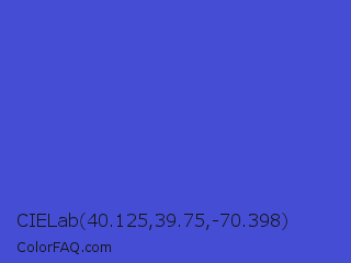 CIELab 40.125,39.75,-70.398 Color is a normal blue color and the nearest color is Iris #5a4fcf. Hex code #454dd4 and RGB value is rgb(69,77,212). In RGB color space, this color is composed of 27% red, 30% green, 83% blue, In CMYK color space, this color is composed of 67% cyan, 64% magenta, 0% yellow , 17% black , In HSL color space, this color has a hue angle of 237° , 62% saturation and 55% lightness.