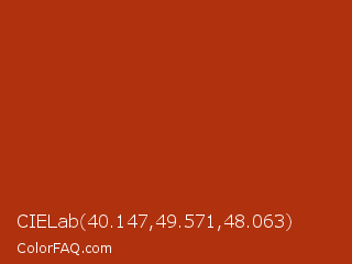 CIELab 40.147,49.571,48.063 Color is a normal red color and the nearest color is Rust #b7410e. Hex code #af310d and RGB value is rgb(175,49,13). In RGB color space, this color is composed of 69% red, 19% green, 5% blue, In CMYK color space, this color is composed of 0% cyan, 72% magenta, 93% yellow , 31% black , In HSL color space, this color has a hue angle of 13° , 86% saturation and 37% lightness.