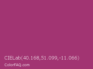 CIELab 40.168,51.099,-11.066 Color is a normal magenta color and the nearest color is Royal Heath #ab3472. Hex code #a23472 and RGB value is rgb(162,52,114). In RGB color space, this color is composed of 64% red, 20% green, 45% blue, In CMYK color space, this color is composed of 0% cyan, 68% magenta, 30% yellow , 36% black , In HSL color space, this color has a hue angle of 326° , 51% saturation and 42% lightness.