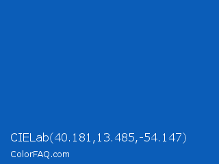 CIELab 40.181,13.485,-54.147 Color is a normal blue color and the nearest color is Green Blue #1164b4. Hex code #0b5db8 and RGB value is rgb(11,93,184). In RGB color space, this color is composed of 4% red, 36% green, 72% blue, In CMYK color space, this color is composed of 94% cyan, 49% magenta, 0% yellow , 28% black , In HSL color space, this color has a hue angle of 212° , 89% saturation and 38% lightness.