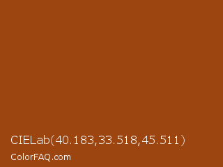 CIELab 40.183,33.518,45.511 Color is a normal orange color and the nearest color is Oregon #9b4703. Hex code #9c4510 and RGB value is rgb(156,69,16). In RGB color space, this color is composed of 61% red, 27% green, 6% blue, In CMYK color space, this color is composed of 0% cyan, 56% magenta, 90% yellow , 39% black , In HSL color space, this color has a hue angle of 23° , 81% saturation and 34% lightness.