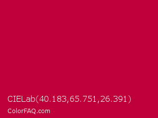 CIELab 40.183,65.751,26.391 Color is a normal rose color and the nearest color is Crimson Glory #be0032. Hex code #bf0038 and RGB value is rgb(191,0,56). In RGB color space, this color is composed of 75% red, 0% green, 22% blue, In CMYK color space, this color is composed of 0% cyan, 100% magenta, 71% yellow , 25% black , In HSL color space, this color has a hue angle of 342° , 100% saturation and 37% lightness.