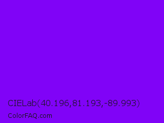 CIELab 40.196,81.193,-89.993 Color is a normal purple color and the nearest color is Violet Color Wheel #7f00ff. Hex code #8003f7 and RGB value is rgb(128,3,247). In RGB color space, this color is composed of 50% red, 1% green, 97% blue, In CMYK color space, this color is composed of 48% cyan, 99% magenta, 0% yellow , 3% black , In HSL color space, this color has a hue angle of 271° , 98% saturation and 49% lightness.