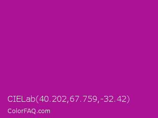 CIELab 40.202,67.759,-32.42 Color is a normal magenta color and the nearest color is Violet Eggplant #991199. Hex code #ac1295 and RGB value is rgb(172,18,149). In RGB color space, this color is composed of 67% red, 7% green, 58% blue, In CMYK color space, this color is composed of 0% cyan, 90% magenta, 13% yellow , 33% black , In HSL color space, this color has a hue angle of 309° , 81% saturation and 37% lightness.