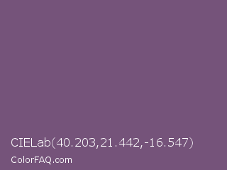 CIELab 40.203,21.442,-16.547 Color is a normal magenta color and the nearest color is Salt Box #685e6e. Hex code #75537a and RGB value is rgb(117,83,122). In RGB color space, this color is composed of 46% red, 33% green, 48% blue, In CMYK color space, this color is composed of 4% cyan, 32% magenta, 0% yellow , 52% black , In HSL color space, this color has a hue angle of 292° , 19% saturation and 40% lightness.