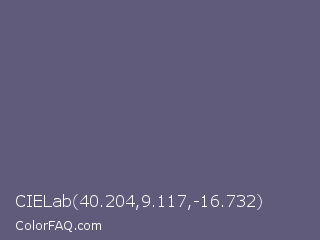 CIELab 40.204,9.117,-16.732 Color is a normal indigo color and the nearest color is Comet #5c5d75. Hex code #605b7a and RGB value is rgb(96,91,122). In RGB color space, this color is composed of 38% red, 36% green, 48% blue, In CMYK color space, this color is composed of 21% cyan, 25% magenta, 0% yellow , 52% black , In HSL color space, this color has a hue angle of 250° , 15% saturation and 42% lightness.