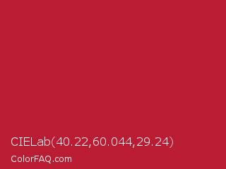 CIELab 40.22,60.044,29.24 Color is a normal red color and the nearest color is Cardinal #c41e3a. Hex code #b91c33 and RGB value is rgb(185,28,51). In RGB color space, this color is composed of 73% red, 11% green, 20% blue, In CMYK color space, this color is composed of 0% cyan, 85% magenta, 72% yellow , 27% black , In HSL color space, this color has a hue angle of 351° , 74% saturation and 42% lightness.