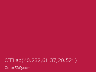 CIELab 40.232,61.37,20.521 Color is a normal red color and the nearest color is Cardinal #c41e3a. Hex code #b91941 and RGB value is rgb(185,25,65). In RGB color space, this color is composed of 73% red, 10% green, 25% blue, In CMYK color space, this color is composed of 0% cyan, 86% magenta, 65% yellow , 27% black , In HSL color space, this color has a hue angle of 345° , 76% saturation and 41% lightness.