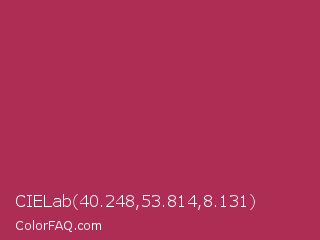 CIELab 40.248,53.814,8.131 Color is a normal rose color and the nearest color is Amaranth Purple #ab274f. Hex code #ad2d54 and RGB value is rgb(173,45,84). In RGB color space, this color is composed of 68% red, 18% green, 33% blue, In CMYK color space, this color is composed of 0% cyan, 74% magenta, 51% yellow , 32% black , In HSL color space, this color has a hue angle of 342° , 59% saturation and 43% lightness.