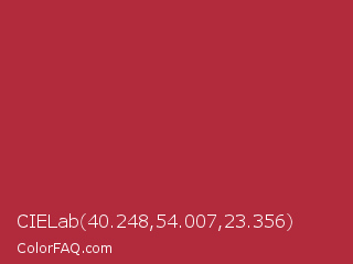 CIELab 40.248,54.007,23.356 Color is a normal red color and the nearest color is Well Read #b43332. Hex code #b12b3c and RGB value is rgb(177,43,60). In RGB color space, this color is composed of 69% red, 17% green, 24% blue, In CMYK color space, this color is composed of 0% cyan, 76% magenta, 66% yellow , 31% black , In HSL color space, this color has a hue angle of 352° , 61% saturation and 43% lightness.