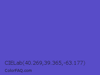 CIELab 40.269,39.365,-63.177 Color is a normal indigo color and the nearest color is Iris #5a4fcf. Hex code #584cc8 and RGB value is rgb(88,76,200). In RGB color space, this color is composed of 35% red, 30% green, 78% blue, In CMYK color space, this color is composed of 56% cyan, 62% magenta, 0% yellow , 22% black , In HSL color space, this color has a hue angle of 246° , 53% saturation and 54% lightness.