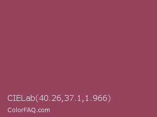 CIELab 40.26,37.1,1.966 Color is a normal rose color and the nearest color is Vin Rouge #983d61. Hex code #96445d and RGB value is rgb(150,68,93). In RGB color space, this color is composed of 59% red, 27% green, 36% blue, In CMYK color space, this color is composed of 0% cyan, 55% magenta, 38% yellow , 41% black , In HSL color space, this color has a hue angle of 342° , 38% saturation and 43% lightness.