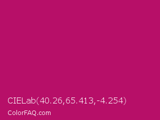 CIELab 40.26,65.413,-4.254 Color is a normal rose color and the nearest color is Lipstick #ab0563. Hex code #b70f68 and RGB value is rgb(183,15,104). In RGB color space, this color is composed of 72% red, 6% green, 41% blue, In CMYK color space, this color is composed of 0% cyan, 92% magenta, 43% yellow , 28% black , In HSL color space, this color has a hue angle of 328° , 85% saturation and 39% lightness.