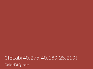 CIELab 40.275,40.189,25.219 Color is a normal red color and the nearest color is Sweet Brown #a83731. Hex code #a13f38 and RGB value is rgb(161,63,56). In RGB color space, this color is composed of 63% red, 25% green, 22% blue, In CMYK color space, this color is composed of 0% cyan, 61% magenta, 65% yellow , 37% black , In HSL color space, this color has a hue angle of 4° , 48% saturation and 43% lightness.