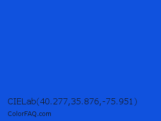 CIELab 40.277,35.876,-75.951 Color is a normal blue color and the nearest color is New Car #214fc6. Hex code #1052de and RGB value is rgb(16,82,222). In RGB color space, this color is composed of 6% red, 32% green, 87% blue, In CMYK color space, this color is composed of 93% cyan, 63% magenta, 0% yellow , 13% black , In HSL color space, this color has a hue angle of 221° , 87% saturation and 47% lightness.