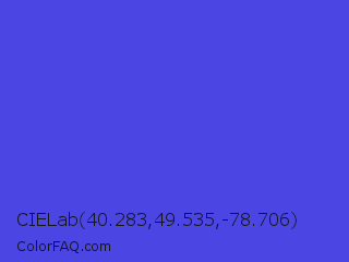 CIELab 40.283,49.535,-78.706 Color is a normal indigo color and the nearest color is Majorelle Blue #6050dc. Hex code #4b46e3 and RGB value is rgb(75,70,227). In RGB color space, this color is composed of 29% red, 27% green, 89% blue, In CMYK color space, this color is composed of 67% cyan, 69% magenta, 0% yellow , 11% black , In HSL color space, this color has a hue angle of 242° , 74% saturation and 58% lightness.