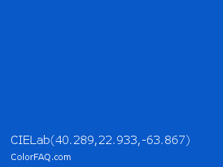 CIELab 40.289,22.933,-63.867 Color is a normal blue color and the nearest color is Science Blue #0066cc. Hex code #0a59c9 and RGB value is rgb(10,89,201). In RGB color space, this color is composed of 4% red, 35% green, 79% blue, In CMYK color space, this color is composed of 95% cyan, 56% magenta, 0% yellow , 21% black , In HSL color space, this color has a hue angle of 215° , 91% saturation and 41% lightness.