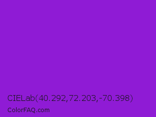 CIELab 40.292,72.203,-70.398 Color is a normal purple color and the nearest color is Blue Violet #8a2be2. Hex code #8f1bd5 and RGB value is rgb(143,27,213). In RGB color space, this color is composed of 56% red, 11% green, 84% blue, In CMYK color space, this color is composed of 33% cyan, 87% magenta, 0% yellow , 16% black , In HSL color space, this color has a hue angle of 277° , 78% saturation and 47% lightness.