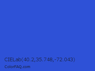 CIELab 40.2,35.748,-72.043 Color is a normal blue color and the nearest color is New Car #214fc6. Hex code #2e51d7 and RGB value is rgb(46,81,215). In RGB color space, this color is composed of 18% red, 32% green, 84% blue, In CMYK color space, this color is composed of 79% cyan, 62% magenta, 0% yellow , 16% black , In HSL color space, this color has a hue angle of 228° , 68% saturation and 51% lightness.