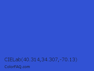 CIELab 40.314,34.307,-70.13 Color is a normal blue color and the nearest color is New Car #214fc6. Hex code #3152d4 and RGB value is rgb(49,82,212). In RGB color space, this color is composed of 19% red, 32% green, 83% blue, In CMYK color space, this color is composed of 77% cyan, 61% magenta, 0% yellow , 17% black , In HSL color space, this color has a hue angle of 228° , 65% saturation and 51% lightness.