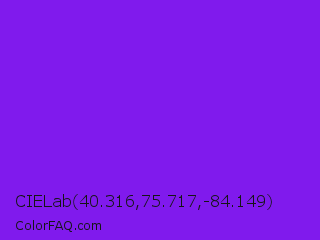 CIELab 40.316,75.717,-84.149 Color is a normal violet color and the nearest color is Blue Violet #8a2be2. Hex code #801aed and RGB value is rgb(128,26,237). In RGB color space, this color is composed of 50% red, 10% green, 93% blue, In CMYK color space, this color is composed of 46% cyan, 89% magenta, 0% yellow , 7% black , In HSL color space, this color has a hue angle of 269° , 85% saturation and 52% lightness.