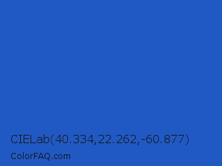 CIELab 40.334,22.262,-60.877 Color is a normal blue color and the nearest color is New Car #214fc6. Hex code #2159c4 and RGB value is rgb(33,89,196). In RGB color space, this color is composed of 13% red, 35% green, 77% blue, In CMYK color space, this color is composed of 83% cyan, 55% magenta, 0% yellow , 23% black , In HSL color space, this color has a hue angle of 219° , 71% saturation and 45% lightness.