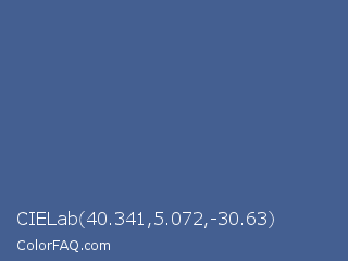 CIELab 40.341,5.072,-30.63 Color is a normal blue color and the nearest color is Queen Blue #436b95. Hex code #445f91 and RGB value is rgb(68,95,145). In RGB color space, this color is composed of 27% red, 37% green, 57% blue, In CMYK color space, this color is composed of 53% cyan, 34% magenta, 0% yellow , 43% black , In HSL color space, this color has a hue angle of 219° , 36% saturation and 42% lightness.