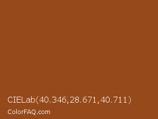 CIELab 40.346,28.671,40.711 Color is a normal orange color and the nearest color is Rope #8e4d1e. Hex code #964a1b and RGB value is rgb(150,74,27). In RGB color space, this color is composed of 59% red, 29% green, 11% blue, In CMYK color space, this color is composed of 0% cyan, 51% magenta, 82% yellow , 41% black , In HSL color space, this color has a hue angle of 23° , 69% saturation and 35% lightness.
