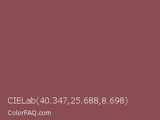 CIELab 40.347,25.688,8.698 Color is a normal red color and the nearest color is Copper Rust #944747. Hex code #8a4e52 and RGB value is rgb(138,78,82). In RGB color space, this color is composed of 54% red, 31% green, 32% blue, In CMYK color space, this color is composed of 0% cyan, 43% magenta, 41% yellow , 46% black , In HSL color space, this color has a hue angle of 356° , 28% saturation and 42% lightness.