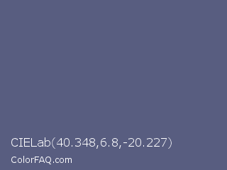 CIELab 40.348,6.8,-20.227 Color is a normal blue color and the nearest color is Comet #5c5d75. Hex code #585d80 and RGB value is rgb(88,93,128). In RGB color space, this color is composed of 35% red, 36% green, 50% blue, In CMYK color space, this color is composed of 31% cyan, 27% magenta, 0% yellow , 50% black , In HSL color space, this color has a hue angle of 233° , 19% saturation and 42% lightness.